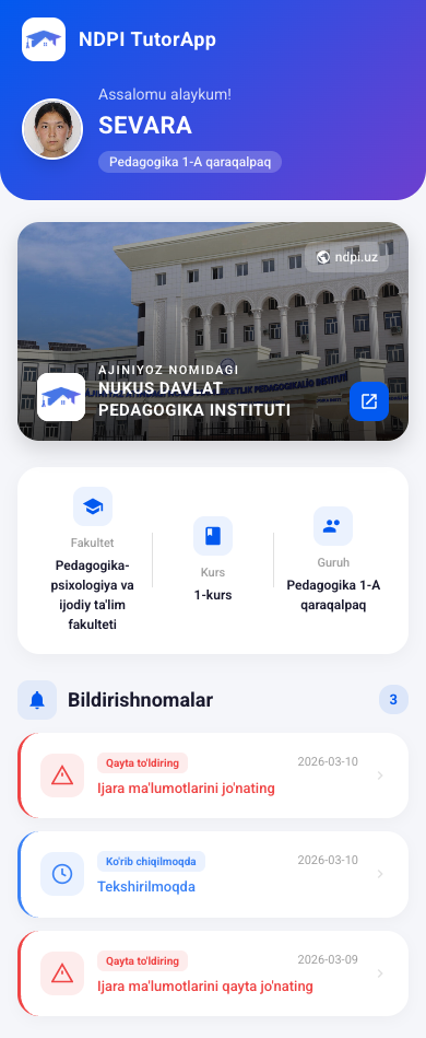 TutorApp NDPI â Namangan davlat pedagogika instituti talabalarining turar joy (ijara, yotoqxona va boshqa) ma'lumotlarini yig'ish, tekshirish va boshqarish uchun mo'ljallangan platforma. Tizim talabalar, tutorlar va administratorlar o'rtasidagi aloqani soddalashtiradi.