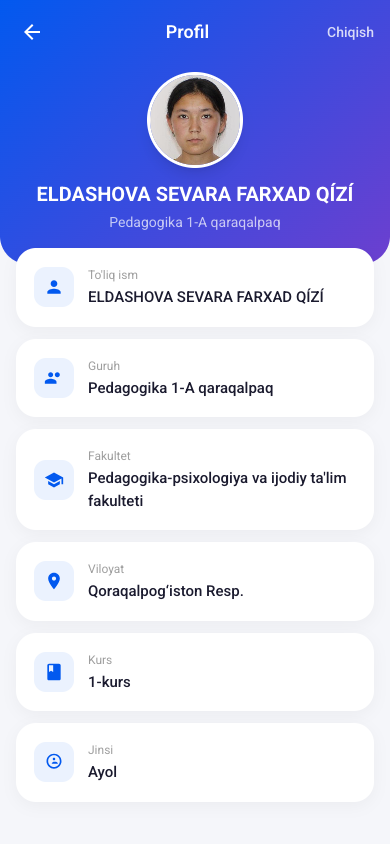Sahifaning yuqori qismida talabaning ismi va profil rasmi ko'rinadi. Bu qismni bosib profil sahifasiga o'tish mumkin.
