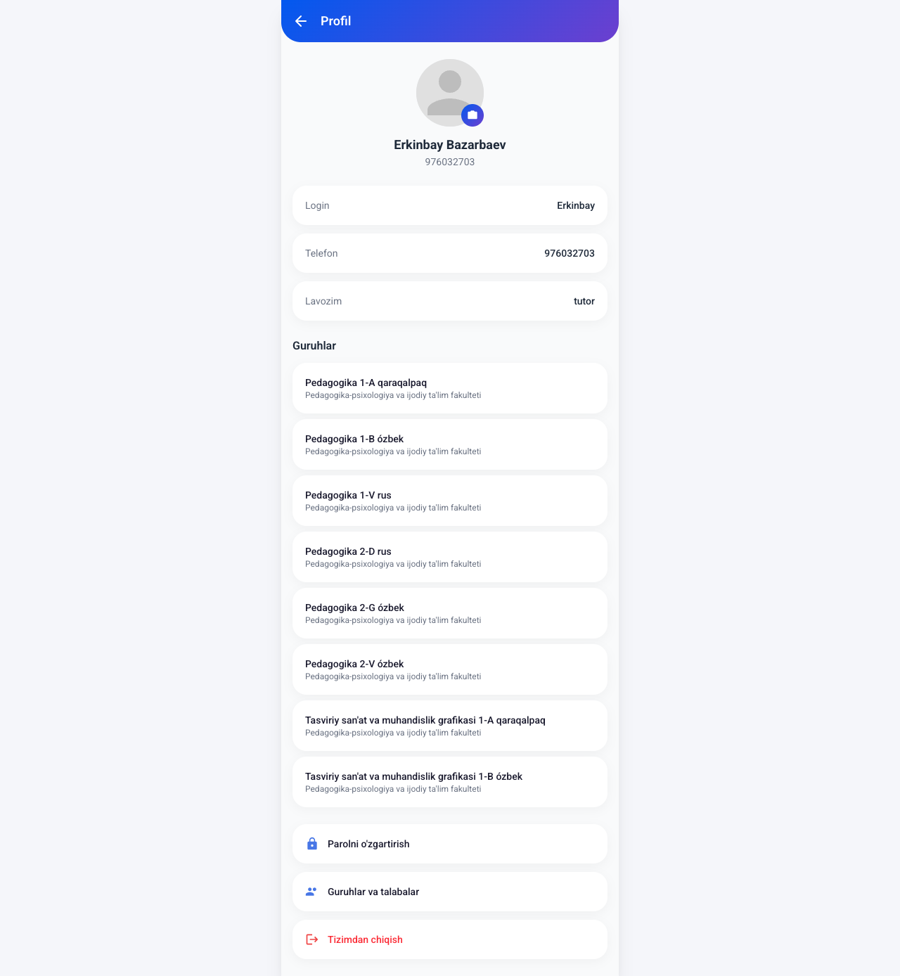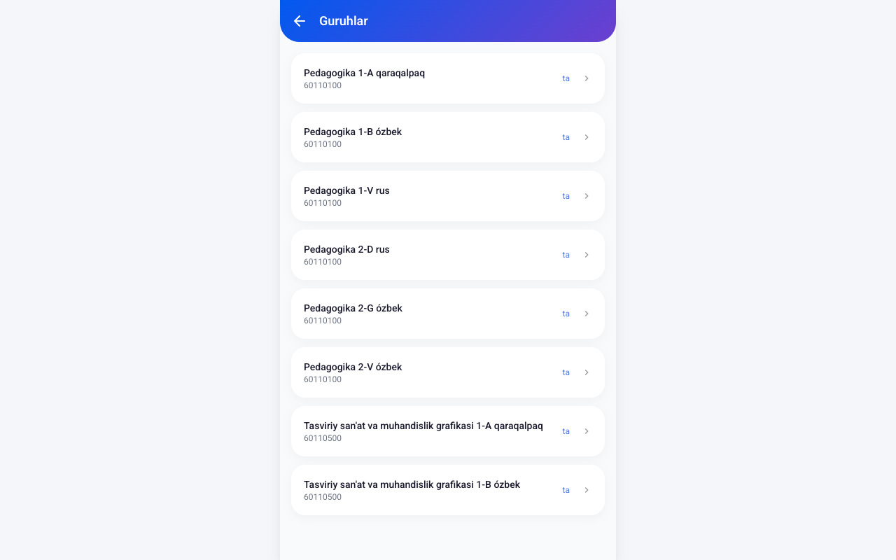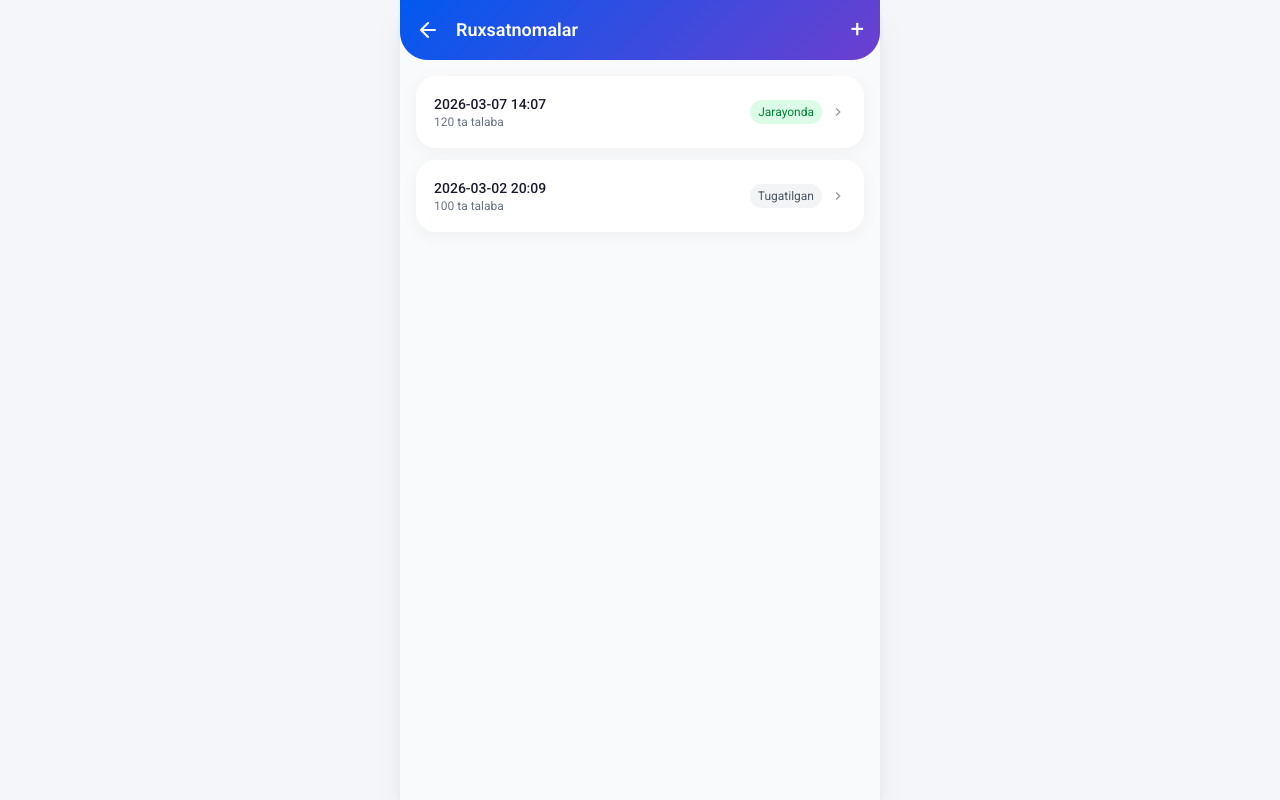 | Tutor | Admin bergan login/parol | Talabalarni tekshirish, status belgilash, ruxsatnomalar yaratish, guruhlarni boshqarish |