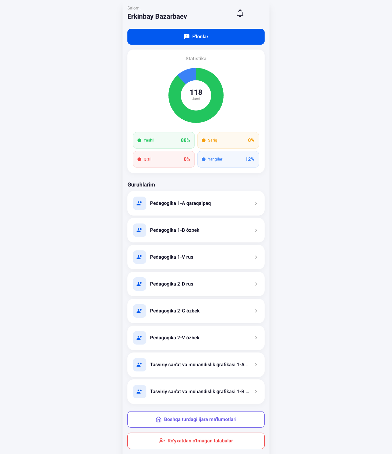 Bosh sahifadagi statistika doiraviy diagrammasida ranglarni bosib, shu statusdagi talabalarni guruhlar bo'yicha ko'rish mumkin.