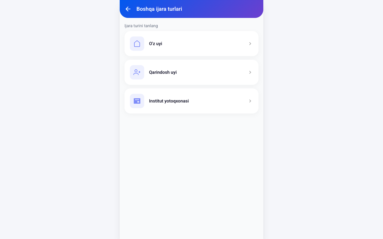 - Ijara uy: manzil, uy egasining ismi va telefon raqami, oylik ijara narxi, uy rasmi
